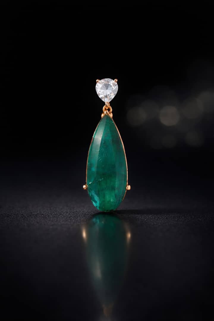 Elegant pendant featuring a pear-shaped emerald with a brilliant accent above. Refined, luminous, and timeless.