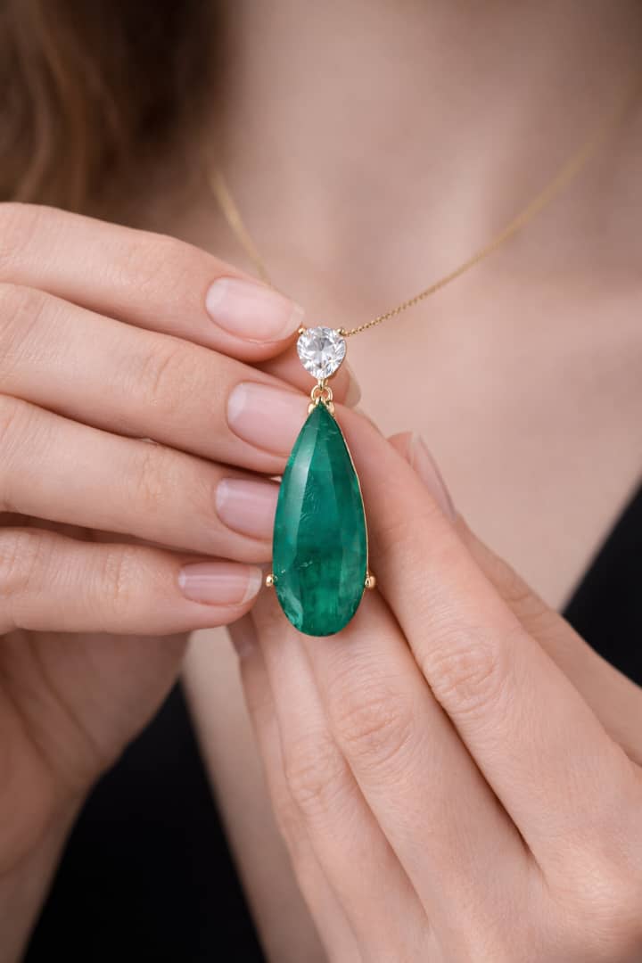 The main gemstone gracefully hangs from a brilliant clear crystal, adding luminosity and refined contrast while enhancing the pendant’s natural flow. The warm gold-tone setting provides an exclusive finish, framing the emerald with a modern yet timeless aesthetic.