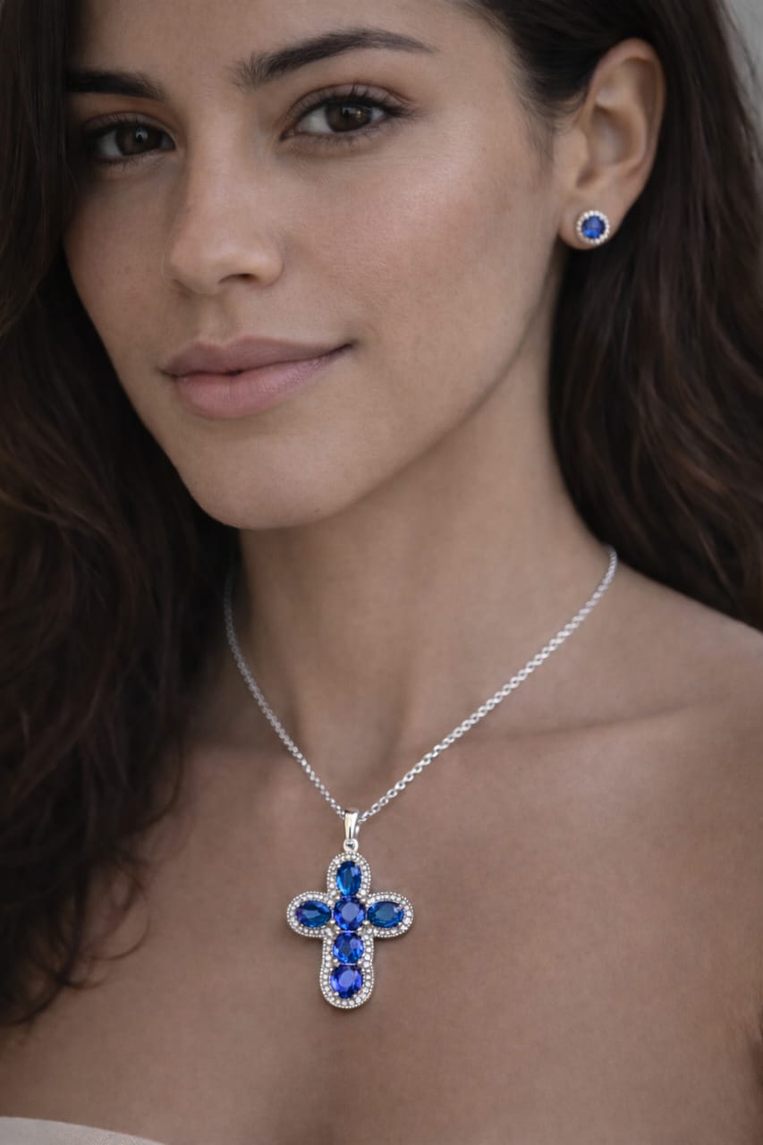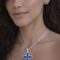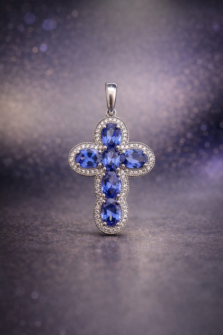 Cross-shaped pendant featuring oval tanzanite gemstones with a sparkling halo. Elegant, symbolic, and timeless.